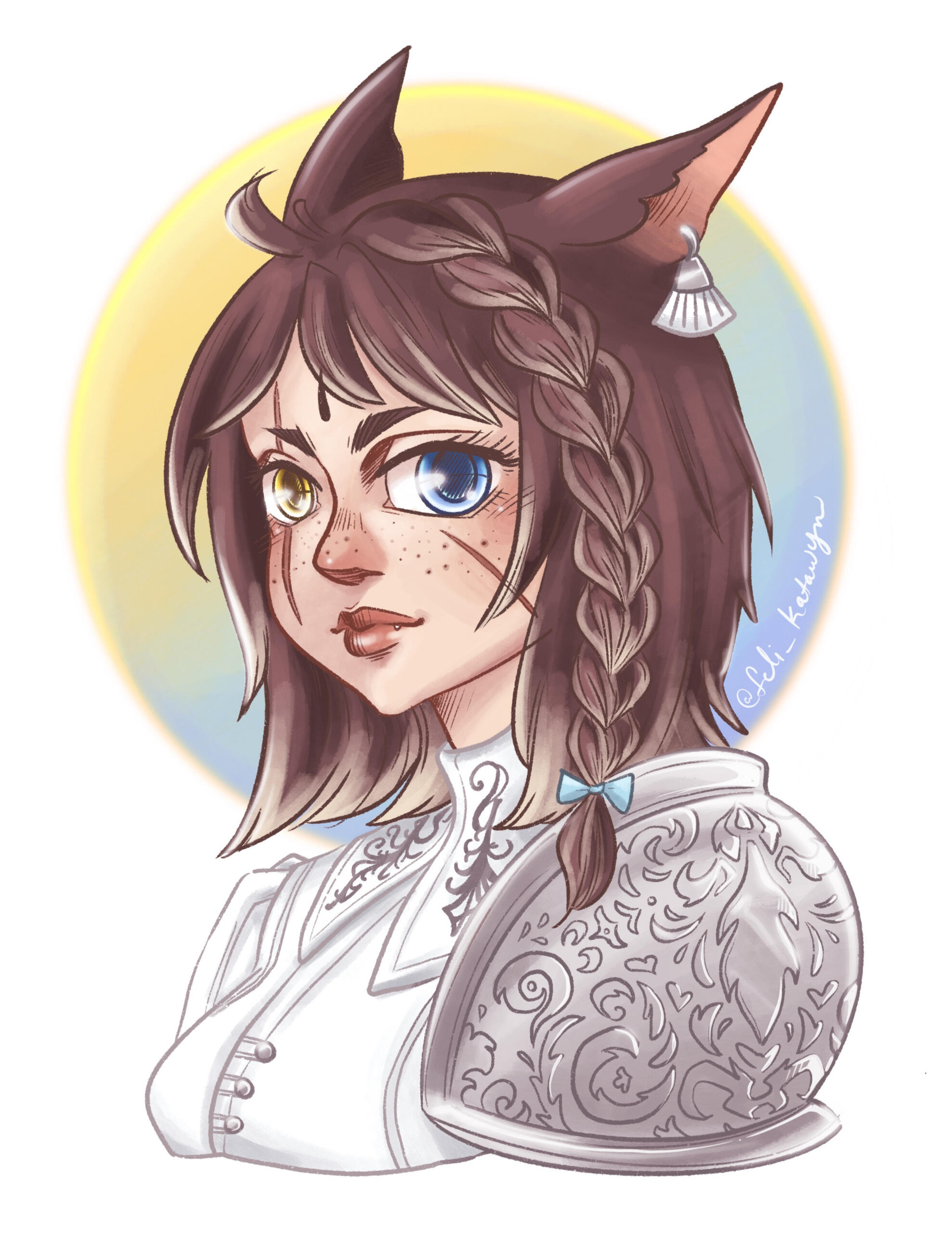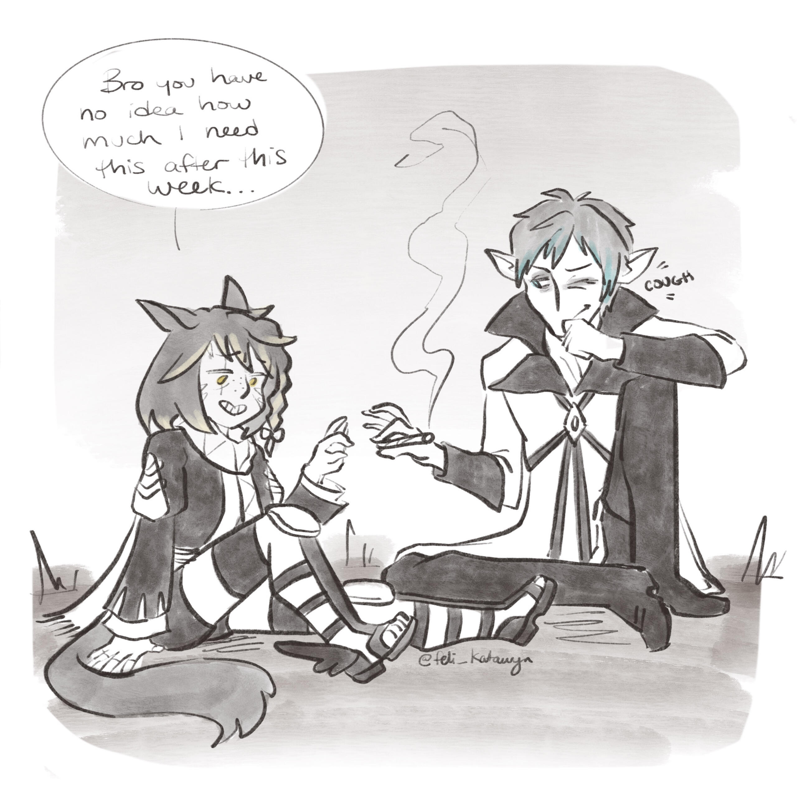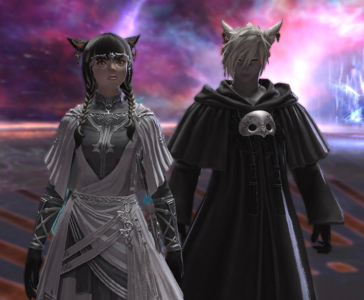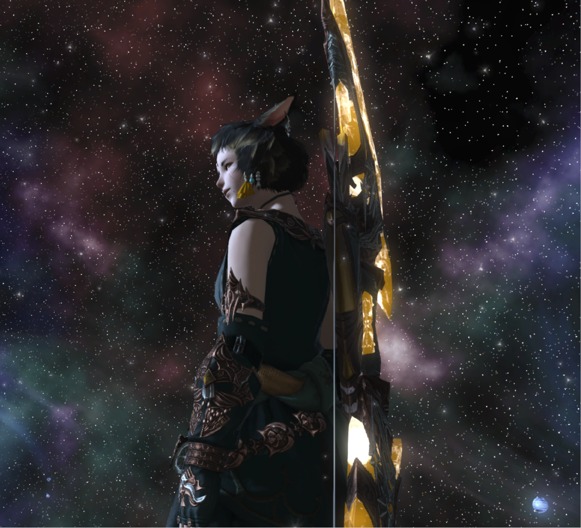 BEGINNINGS- Felicity “Feli” Katawyn is the Warrior of Light, but before that she was just an orphan Miqote girl of unknown Moonkeeper origins. She does not remember much before stumbling into Gridania one day, confused but otherwise ready for whatever the world threw at her. She was directed to seek out Mother Miounne, who effectively adopted her. Under Mother Miounne’s care, she got to know the people of Gridania through numerous errands and extensive boredom, picking up any and all skills that the Twelveswood city state had to offer.- Archer was her first and preferred job, where she learned to hunt and fend for herself. It also offered her time to be alone. This is where she met Guydelot and Samson, whom she considered her first real friends in her memory. Much of her short, confusing youth was spent alone in the forest, preferring the company of the trees and the wind than to her Gridanian keepers, but hanging with Guydelot and Samson helped her get out of her shell and find joy in making mischief. She was known by the Wood Wailers to be quite a troublesome teen.- Because she has a love of wandering, botany came easy to her and though she doesn’t take it very seriously, she has a good eye for it nonetheless.GROWING- A major turning point in her life was the death of her trusted confidant Haucherfant. It is a death that has stuck to her like bile in the throat, and she has carried that failure with her as a reminder of her limits. There was a lot she did not understand about the man, his supposed feelings for her something she regrets never understanding or noticing until after the fact. But she finds great comfort with the Fortemps family now, and strives to write to Lord Fortemps often.- Her understanding of the world was very limited, and the more she came to understand of what was going on the more she came to resent Empire for it's tyranny. From her earliest dealings with them at the Praetorium, she knew that the Garleans were a force to be reckoned with. But she did not truly understand this until she was bested so easily by Zenos vae Galvus at Rhalgr's Reach. It was the first time someone with comparative strength had bested her, and shaken from her second major failure and the cruel hunt the Prince perpetuated, she vowed to fight against imperialism and all who would subjugate others.FINDING ONESELF- Her unexpected journey to the First left her wanting for answers and with a whirlwind of questions. Emet Selch had given the Scions a lot to think about, but for Feli he had laid a trail that came the closest anyone had ever managed to giving her answers to who she was, and why she was here. This more than anything was something she had been searching for her entire (known) life. Upon his death, she felt like perhaps there was so much more she could have asked him if she had had the nerve.- Feli wanted to distrust Venat after all that happened in the First, but after sparring with and getting to know her on Elpis she feels more of a kinship than she thought she would. She loved talking to Venat about her adventures, feeling a connection she had never had before: a family member to finally recount her life to. (Tyche and Venat got along well despite often having healthy debates).- Following the events of the Final Days and the many mysteries that were solved in the wake of their travels, Feli feels more at peace with her place on this star, and who she is. Thanks to Venat and her friends, she has finally come to the conclusion that who she was does not matter, as long as she likes who she has become. While she is sad that the Scions have "disbanded", she is grateful for the rest and the freedom to travel at her whimsy. She does not intend to stop.IN DEPTH LORE DOC HERE!